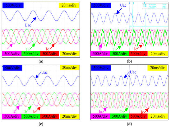 Figure 15d is the output voltage and current waveform of a 2MW multifunctional power grid simulator connected to the stator terminal of a doubly fed machine. From the current waveform, the output current contains 50 Hz fundamental wave and 10 Hz noncharacteristic subharmonics. It is well known that the subsynchronous oscillation (SSO) caused by noncharacteristic subharmonics plays a very important role in motor research, but the existing research is very important. The multifunctional power grid simulator proposed in this paper can provide the necessary research environment for the study of subsynchronous oscillation by giving the frequency and amplitude of the noncharacteristic harmonic voltage below 50 Hz.