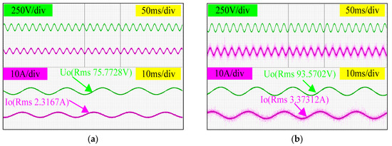 Figure 15a–c respectively show the output of 100 V fifth harmonic voltage waveform; 100 V 50 Hz fundamental wave and 100 V 250 Hz harmonic combined voltage waveform; and 100 V 150 Hz, 100 V 250 Hz, and 100 V 350 Hz harmonic combined voltage waveform of the 2MW multifunctional power grid simulator when no load occurs. From the FFT analysis results in the figure, it can be seen that the 2MW multifunctional power grid simulator can output 100 V 150 Hz, 100 V 250 Hz, and 100 V 350 Hz harmonic combined voltage waveform without load. To simulate the output of specified frequency and amplitude of single or multiple specified harmonic voltage waveforms, Figure 15 shows spectrum analysis of the produced signals. However, the spectrum should be theoretically with discrete values (only the fundamental and harmonics), but the graphs (a), (b), and (c) show continuous spectrum with some peaks; however, with a series of odd harmonic voltages, such big noise in the spectrum is mainly caused by the dead time [24,25,26].