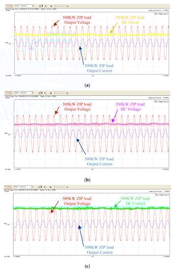 DC voltage, current, and power of ZIP load model: (a) DC output power of ZIP load; (b) DC output power of ZIP load; (c) DC output power of ZIP load.