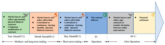 Unlike the major electricity markets operated by Pennsylvania-New Jersey-Maryland(PJM), California Independent System Operator (CAISO), and Electric Reliability Council of Texas (ERCOT) in North America [29,30,31], British Electricity Trading and Transmission Arrangements (BETTA) in Great Britain [32] and Nord Pool Spot in Nordic Europe [33], the YNEM is dominated by medium- and long-term electrical energy transactions briefly described in Figure 1. Moreover, all trading contracts require physical delivery, which means that the final transaction results need to be checked by YNPG [34]. The continuous bidirectional transaction (CBT) is new to the YNEM; it was introduced in the beginning of 2018, and currently, this bidding scheme is applied to the monthly market, where electricity consumers and producers submit a set of price-volume pairs, indicating their willingness to buy and sell electricity for the next operating month [9]. The CBT, together with the original bilateral transaction and matching transaction, constitute the main transaction varieties in the monthly market.