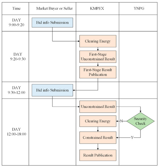 - During the first stage, the sellers cannot obtain the buyer’s demand curves. In the same way, sellers’ supply curves are not available to the buyers. All market participants can bid or cancel a bid until the time is up. After the closure of this stage, the submitted seller and buyer bids are aggregated, resulting in the first-stage unconstrained results by the CETP of Kunming Power Exchange (KMPEX). The results include the market clearing prices (MCPs) of this stage and bid matchings according to the submitted bids [35]. Orders with remaining unmatched volume will enter the second stage first with the same timestamp.