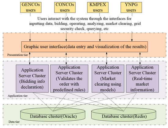 Generating company (GENCO) users, consumption company (CONCO) users, market operators of the KMPEX, etc. can independently and synchronously access the user interfaces for data entry, bidding, operation, analysis, market clearing, grid security checks, querying information, and so on. The requests received in the presentation tier are proposed in the application tier. Components consisting in the application tier constitute four main modules: message queue-based order processing, multilevel order logic verification with predefined rules, market clearing using models (i.e., market clearing models), and real-time push and disclosure of market information. The data generated by the application layer will be stored in the database for archiving. The results are displayed to the user in the presentation tier.