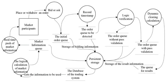 The CBT orders run through the kernel business of the CETP. Figure 5 graphically represents the order data flows in the CETP and analyzes the data flows during order processing. During processing, the orders in the CETP are stored in a message queue. All the orders submitted or canceled are first placed in the original queue. If two bids are made at exactly the same time, the order of entry into the original queue is determined by chance. Next, the orders in the original queue will be marked with a timestamp, as a key indicator of order sorting for the clearing algorithm, and then enter the queue to be detected. Furthermore, based on the trading rules, all orders in the order queue to be detected are checked according to the rules, and those that do not meet the conditions are put into the order queue without pass validation; otherwise, they are put into the order queue with pass validation. Only orders that pass validation can be used for market clearing, and the orders that meet the transaction conditions will be matched to form the final transaction results stored in the result queue. In addition, the market information needs to be calculated logically based on the market process information and pushed to the market participants through the real-time push service. All process and result information for processing an order is stored in a persistent manner.