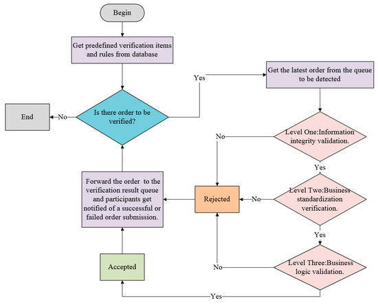 As shown in Figure 6, the verification of the three layers is carried out in sequence. Once the order cannot pass the verification of one layer, the verification failure will be directly determined. It should be noted that the check items in each layer can be adjusted, invalidated, or added when the business rules change. After the verification process, the verification module forwards the order to the verification result queue, and participants get notified of a successful or failed order submission.