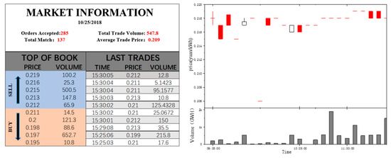 The information-disclosure mechanism is very important to increase market transparency, reduce transaction costs, improve market fairness, and enhance power-system security [44]. In the bidding process of the CBT, market participants can obtain not only their own private information, such as the submitted quantity price, but also the public information of the market, i.e., market information. The real-time display of market information is one of the major features of the CBT in the continuous bidding stage. Normative and transparent information disclosure can weaken information asymmetry. The market information of the CBT mainly includes top of book, market summary, last trades, and candlestick charts, which are effective guides for market participants to make bidding decisions. The market information is explained below, as shown in Figure 7.
