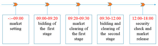 To illustrate the effect and characteristics of CBT, take the power energy trading market in November 2018 as an example. Its process and schedule are shown in Figure 8. The bidding period of the first stage was 09:00–09:20, and that of the second stage was 09:30–12:00. A total of 45 CONCOs and 34 GENCOs participated in this transaction. The bidding and clearing of this transaction are described below.