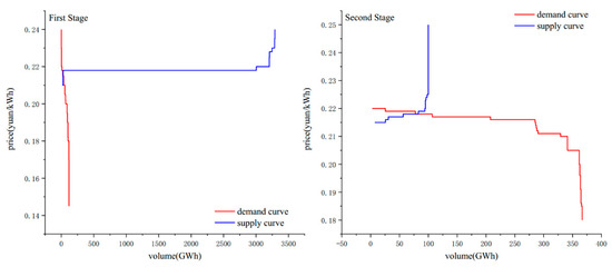 A total of 81 orders (including six orders withdrawn) were declared during the first stage, among which the CONCOs declared 101.929 GWh of electricity, with an average price of 0.19867 yuan/kWh. The declared electric quantity of GENCOs was 2774.818 GWh, with an average price of 0.22544 yuan/kWh. The market bidding data also reflected the characteristics of the YNEM, where supply far exceeds demand. However, during the process of the first stage, the market information was not transparent, which was precious for the bidding-strategy adjustment. The one-round auction made it difficult to realize full competition. As Figure 9 illustrates, buyers and sellers had great differences in price intention. On the demand side, the bid price changed greatly and dispersedly, the bid volume was relatively small, and the demand curve was steep. On the supply side, hydropower plants stored water to high reservoir levels after the wet season, and bid price was usually higher at this point. However, for such hydropower stations with poor regulating performance, they were willing to declare a lower price, to improve the probability of winning the bid, in order to increase its power generation and reduce the risk of water abandonment. The transaction volume of this stage was only 14 GWh, and the average transaction price was 0.21380 yuan/kWh. A total of 24 contracts were concluded, and the rate of trade for the users was only 13.74%.