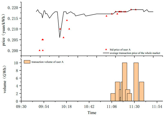 To further illustrate the dynamic bidding process in the continuous bidding stage, i.e., the second stage, a large user (user A) was taken as an example to describe the dynamic bidding and game process based on market information. Figure 10 shows the average transaction price during the period of the entire market used to indicate the market price signal. The bidding price and trading volume of user A, which are drawn in Figure 10, represent its bidding strategy and strategic results, respectively.