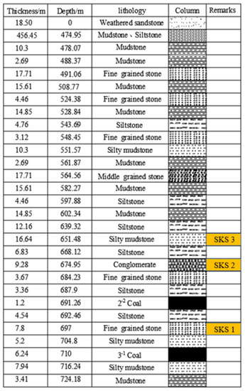 −1101 was 3212 m long and 245 m wide, the coal thickness was 6.2 m, and the dip was 1–7°. The depths of the coal varied from 680 m to 710 m. A 30-m barrier pillar was left to protect auxiliary entry. The occurrence and height of overburden strata varied during mining. The physico-mechanical properties of the overburden strata are shown in