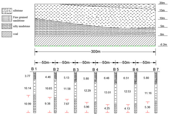 Figure 5. Borehole 7 was 104.5 m from the end-up line. The lithology analysis of the roof was conducted at an interval of 50 m and the variable trend of the roof lithology profile view in the experiment area is shown in