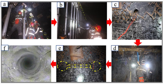 Roof fracturing construction process: (a) Installing drill stems; (b) Drilling holes; (c) Blast testing; (d) Charging process; (e) Crack distribution at the roof surface; (f) Crack distribution in the holes.