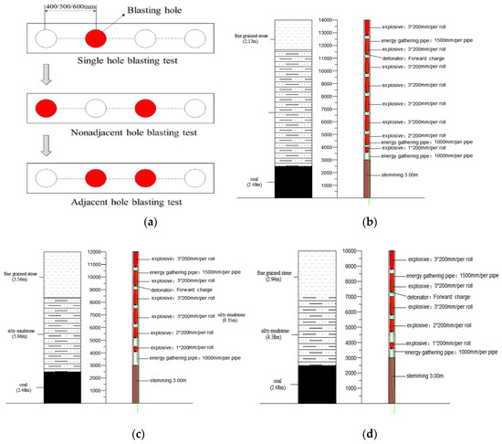 Roof blasting tests and charging parameters. (a) Blasting tests; (b)14 m; (c) 12 m; (d) 10 m.