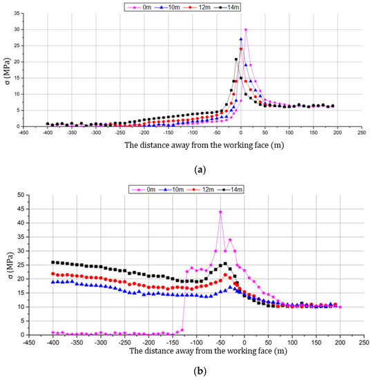 Pressure characteristics of pillars with the distance from the working face. (a) a 4-m stress meter borehole; (b) a 8-m stress meter borehole.