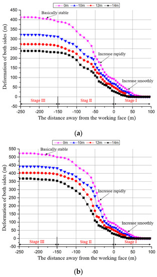 (3) Comparing three roof fracturing heights, namely, 14 m, 12 m, and 10 m, the 14-m height exhibited the best deformation control performance. Therefore, when considering the conditions in the field, the roof fracturing height was higher and the deformation of the auxiliary entry was smaller.