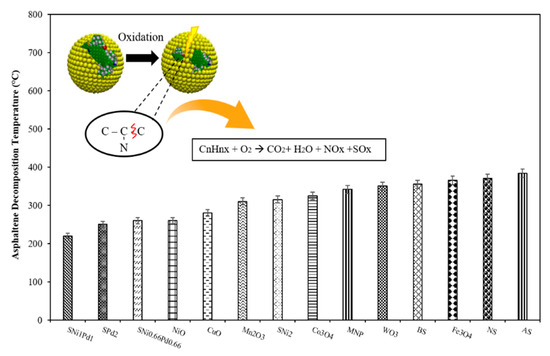 - Nassar, N.N.; Hassan, A.; Pereira-Almao, P. Comparative oxidation of adsorbed asphaltenes onto transition metal oxide nanoparticles. Colloids Surf. A Physicochem. Eng. Asp. 2011, 384, 145–149. [Google Scholar] [CrossRef]