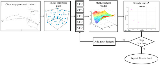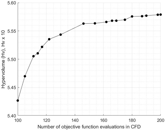 - Addition of new design points. Once the results of the CFD simulations of the new design points are obtained, the data are added to the initial sampling to create a new surrogate model and an optimization cycle until the stop criterion is met [28,57]. The purpose of this step is to add points for creating a new surrogate model providing a more optimal objective function.