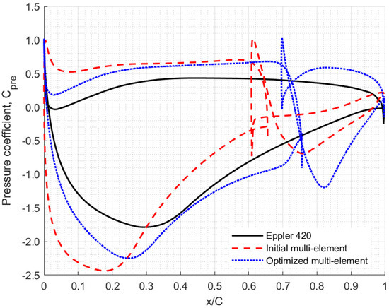 - Stop criterion. During this stage, the same number of new designs points than those ones considered in the initial sampling plan were assessed. Therefore, a total of 200 CFD simulations were considered in order to find the optimal design point that defines the geometric configuration of the multi-element hydrofoil. A proper hydrofoil for the hydrokinetic turbine application must have a high CL/CD ratio for improving the performance, and a high Cpre (lower suction) on the suction side to prevent cavitation. After 200 iterations, the optimized multi-element hydrofoil was defined by the best design point of the last Pareto front (Pareto optimal front) that achieved the optimization requirements (maximum CL and minimum CD), which were subjected to the considered constraints.
