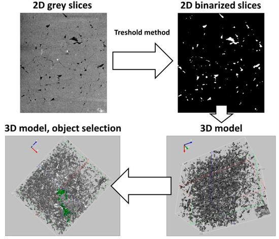 Computed X-ray tomography allows extracting the geometrical model of the pore space in detail [27,28]. The physical basis of the measurements is connected with Beer’s Law. In the beginning, a CT measurement was carried out on the rock sample. The length of the sample was about 3 mm, with a width of about 3 mm. The sample size allowed for achieving the expected voxel size (the smaller the investigated sample, the better CT resolution). The Nanotom S (General Electric, Boston, MA, USA) is equipped with a 57 W X-ray tube with a maximum operating voltage of 180 kV, Hamamatsu detector (HAM C 7942CA-02) with a 12-bit resolution and 2300 × 2300 pixel matrix. The voxel size in this study was 0.8 × 0.8 × 0.8 µm3. Next, CT data was processed to give the final output in the form of the 3D grey level image of the rock. Using binarization (threshold method), the pore space was extracted from the image and filtrated against the noise. The second stage was connected with the qualitative and quantitative interpretation of the pore space using poROSE software (poROus materials examination SoftwarE, AGH University of Science and Technology, Kraków, Poland) [29,30]. The scheme of the CT analysis is presented in Figure 1.