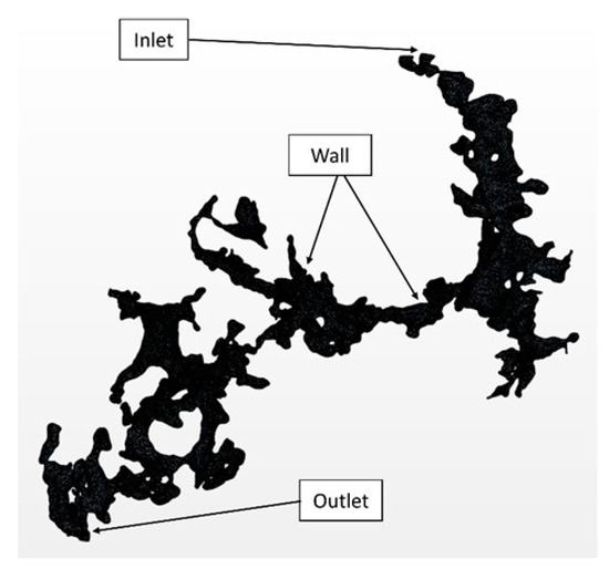 The geometrical model of the analyzed sample was prepared to conduct simulations of fluid flow. Figure 2 presents the geometrical model of the largest object. To create a numerical mesh, the object was divided into 1,574,954 finite volumes with a polyhedral shape. The base size of the finite volume was set to 10−6 m, where the total height of the analyzed sample is equal to 96 × 10−5 m.