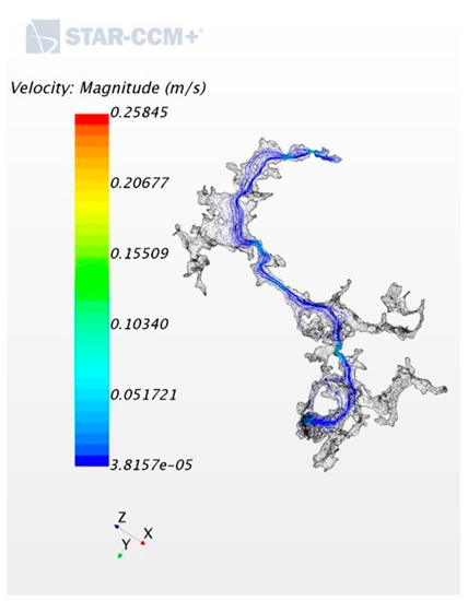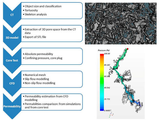 Computed X-ray tomography (CT) is an efficient imaging technique to retrieve information about the 3D pore space of the rock [5]. That is why it is still an appreciated and developed technique. Computed X-ray tomography, together with computational fluid dynamics, have almost no limitations—almost, because only the CT resolution limits this research potential. CT and CFD is a key method in absolute permeability calculations for many types of rocks, different pore space objects (pores, fractures, etc.) and fluids [6,7,8,9,10,11,12,13,14].