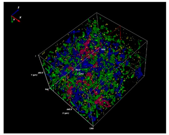 Classification of the pore volume, colors: red—1–99 vx; orange—100–999 vx; yellow—1000–9999 vx; green—10,000–99,999 vx; dark blue—100,000–999,999 vx; magenta—above 1,000,000 vx; poROSE software.