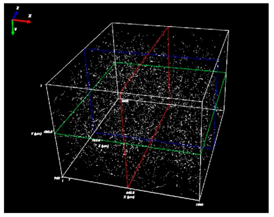 The largest object has 2.18 × 106 µm3 in volume, a thickness mean equal to 18 µm, while the Feret diameter is 449 µm. The advance analysis gave the information about the mean intercept length and tortuosity of the largest object in the sample, which are 17.18 µm and 2.50, respectively.