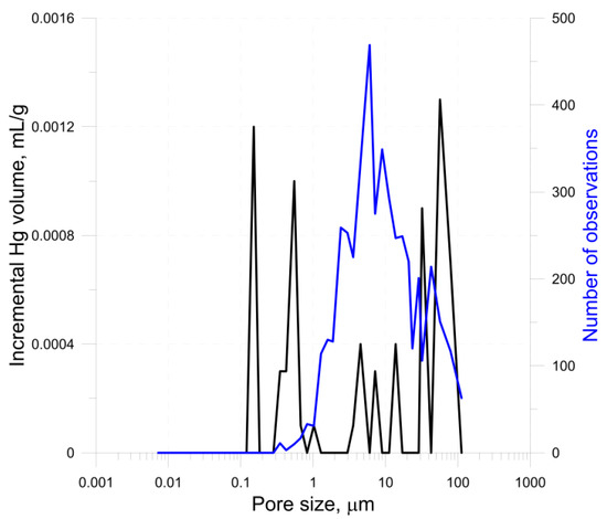 Absolute permeability from the gas permeameter is 0.023 mD for the tested sample. Total porosity from CT is equal to 2.30%, while effective porosity from the mercury porosimetry is 0.28%. Figure 6 presents the pore size distribution based on mercury porosimetry and computed X-ray tomography data. Mercury porosimetry was carried out using AutoPore IV 9500 (Micromeritics, Norcross, GA, USA) with the maximum working pressure as 60,000 psi. The pore-fracture system predominates in the sample. CT data provided a broad range of information regarding all pores, connected and isolated ones (effective and total porosity), while mercury porosimetry only provided information regarding the connected ones.