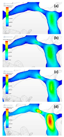 Velocity distribution in the pore space of tight sandstone calculated using the model without molecules slip at the pore walls (a) and partial slip model with different Tangential Momentum Accommodation Coefficient (TMAC) values equal to 0.9 (b), 0.5 (c), and 0.1 (d).