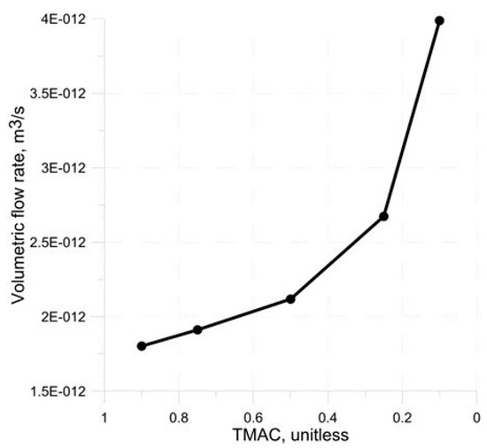 Volumetric flow rate at the pore space outlet calculated using a partial slip model and different values of TMAC.