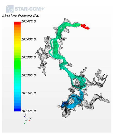 All calculations were performed for nitrogen properties and pressure of 101,325 Pa (Table 1 and Table 2). Streamlines for fluid flow distribution colored by pressure and velocity are presented in Figure 9 and Figure 10, respectively. The difference of pressure between inlet and outlet can vary in a defined range. In all simulations, the same value 100 Pa was adopted to keep similar conditions during results comparison.