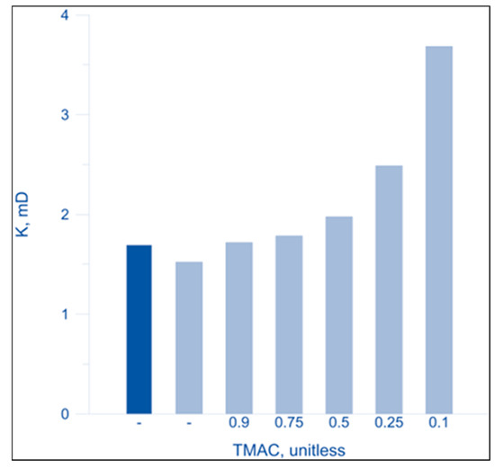 The changes in the nitrogen volumetric flow rate in the same pore space sample, for different TMAC values, are presented in Figure 8. Additionally, the calculated volumetric flow rate of nitrogen without slip velocity is presented.