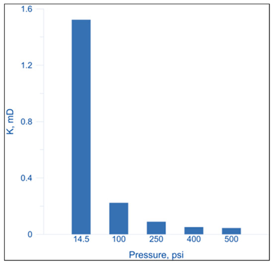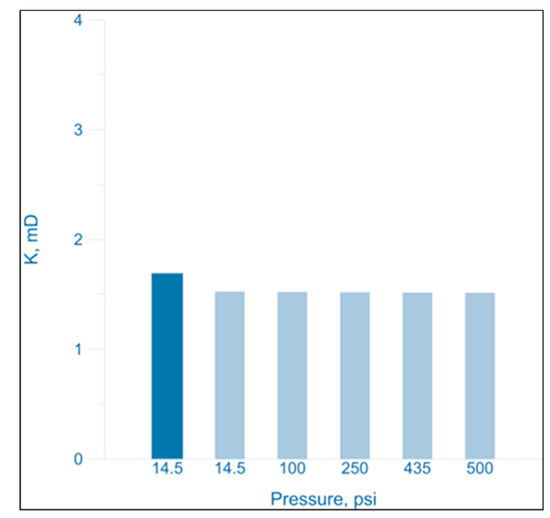 The second series of simulations were performed using incompressible gas (nitrogen) with properties determined at different average pressures, keeping the same pressure difference between the inlet and outlet of the sample (p1 − p2 = 100 Pa). Calculated results for the range of pressures analyzed (14.5 to 500 psi) have the same level of value, close to 1.5 mD (Figure 12). All these values are slightly different and smaller than a value obtained for the case with water.