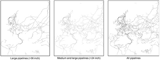 The geographic information of the European natural gas network was extracted from the ENTSOG’s transparency platform [42]. The three pipeline layers available (“medium and large pipelines” (>24 inch), “large pipelines” (>36 inch) and “all pipelines” (all pipelines recorded on the ENTSOG transparency platform)) were downloaded in form of 1024 high-resolution images (raster grid) for each layer as displayed in Figure 1.