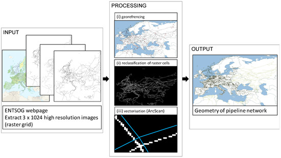 Since the ENTSOG maps are in an unknown coordinate system, the maps have to be georeferenced. The information processing is similar to Jensen and Pinson 2017 [37] and illustrated in Figure 2. First, 78 georeferenced points evenly distributed throughout Europe (see Figure 2, (i) georeferencing) were chosen according to identified “Landmark” points of the network. The georeferencing transformation type “Thin Plate Spline” was applied to georeference the ENTSOG maps. The resulting georeferenced images, were then reclassified to achieve binary cell values (0 or 1, see Figure 2, (ii) reclassification of raster cells). This is done because the ArcScan tool requires a binary raster grid. Finally, to vectorize the raster grid, the ArcScan function provided by ArcGIS was used [2]. The default vectorization settings were applied, as they provide a satisfactory vectorization. To result in the different pipeline diameters provided by ENTSOG (in Figure 1), the three georeferenced vector files were combined.
