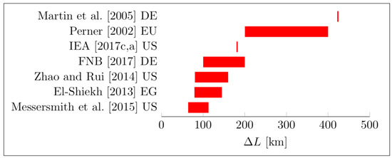 Average distance ΔL between compressor stations with corresponding source and country.