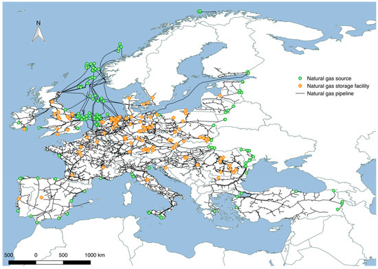 The assembled infrastructure information is displayed in Figure 4. The data is imported to GIS (i.e., QGIS [50]) to provide a graphical representation of the European natural gas network.