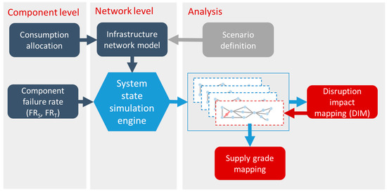 In the following sections, an overview of the models and the applied analysis methods is given. The models are assembled using the collected geospatial information (see Section 2.1). The consumption is allocated to the infrastructure components (Section 2.2.1) and an infrastructure network model is built (Section 2.2.2). The component failure rates caused by seismic hazards (FRS) and technical failures (FRT) are estimated (Section 2.2.3). The network performance in case of a component failure is then computed using a system state simulation engine (Section 2.2.4). Finally, the disruption impact mapping (DIM), which is essential to assess the system’s disruption performance, and a scenario-based supply grade mapping (with focus on Italy) are described in Section 2.2.4.