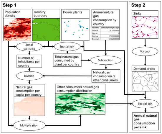The second step (Figure 6, Step 2) involves the building of the consumption areas, i.e., a division of the land area according to the identified sinks of the network. Sinks are all the network points (e.g., junctions) on land, which are not identified as sources (e.g., consumer vertices). It is assumed that the natural gas consumption can be allocated to the closest natural gas sink of the network. This assumption is similar to previous studies, where the number of people connected to the network instead of the consumption volumes have been considered [7,8]. The assumption, however, allows applying a Voronoi algorithm (also called Thiessen algorithm). The algorithm cuts the nearest neighbor connection lines of the sinks rectangular into half and therefore creates subareas, containing one single sink each [69]. The consumption of each sink is found by summing up the mapped OC and the power plant consumption for the corresponding area. The consumption year is set to 2015 because the population density is also provided for the year 2015. However, the natural gas power plant consumption from the Enipedia database [52] stems partially from a previous project, which was recording carbon emissions from 2012. In this context, as a first approximation, these emissions have been allocated to 2015, since the natural gas consumption for the thermal power stations is on the same level [68]. Finally, seasonal consumption differences throughout a year are neglected as the pipeline flow capacity was based on an annual average.