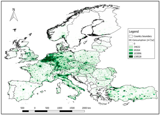 where Pi is the population of each raster cell and is provided by the European population GIS raster [55] with the resolution of 30 arc-seconds (−1 km). The OC consumption map is displayed in Figure 7. The colour of cell i represents the annually consumed volume of natural gas (Ci) within this particular raster cell.
