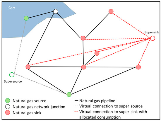 The search is repeated until no additional flow can be added. For the search the Boykov–Kolmogorov algorithm is applied, because it is the fastest algorithm available to conduct this kind of analysis [72]. The European natural gas network, as well as the resulting graph G, has multiple sources and sinks. To convert the multiple source/sink problem to a single source/sink problem, a super source s* and a super sink t* are introduced. Figure 8 illustrates conceptually this transformation. The estimated consumption volumes (see Section 2.2.1) of each sink can be allocated to the network as capacities of the connection to the super sink t*. For the flow simulation of the network, MATLAB [73] and and/or Python’s igraph library [74] and corresponding packages were used.