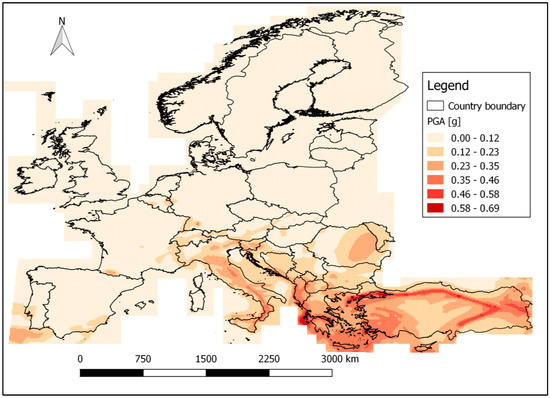 European seismic hazard map for peak ground acceleration (PGA) values with a 10% probability of exceedance in a 50 years period in units of standard gravity (g) [57].