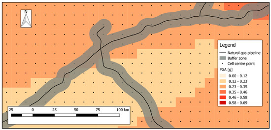 The exposure analysis involves the PGA of a likely earthquake at the geographic location of each component. The PGA of the closest raster cells for each component are averaged using a buffer zone around the corresponding component. The width of the buffer region is defined as the diagonal of a raster cell. This ensures that at least one earthquake hazard map raster cell center point is present in the buffer region. Figure 10 illustrates the seismic hazard analysis, including the applied buffer zone.