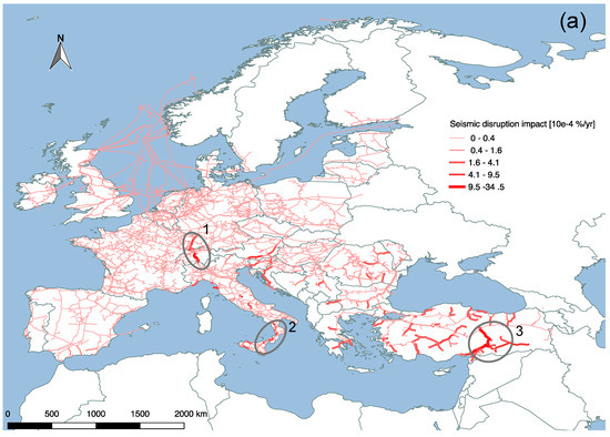 In this analysis, seismic hazards and technical failures are considered. The seismic hazard map for Europe [57] is used to analyze the exposure of the infrastructure to earthquakes. The data is provided as a raster grid on a ~11 km resolution for a 10% probability of exceedance in 50 years of a certain peak ground acceleration (PGA). The given parameters are inputs currently required by almost all National Annexes of the Eurocode 8, a standard for the design of structures for earthquake resistance [58]. An average lifetime of natural gas infrastructure system components is used to assess the total seismic hazard exposure and the mean annual seismic failure rate of that component and the network.