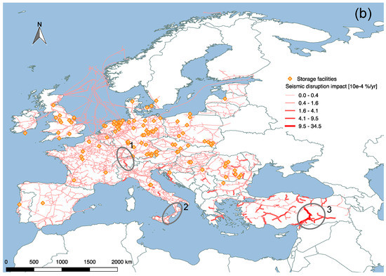 Therefore, the first objective of this study is to illustrate how to collect geographic information on natural gas network infrastructure using geographic information system (GIS) tools for the assembly of the natural gas network model for Europe as an example. This follows the spirit of a more open source, transparent and reproducible data employment of research analyzing the energy sector [38], ultimately aiming to provide a realistic representation of the European natural gas network. The second objective is to conduct a disruption impact analysis of a single pipeline failure using complex networks approaches and two scenarios (with and without storage facilities). This leads not only to the identification of potential bottle-necks of the infrastructure network, but also considers aspects of exposure and component failure. Therefore, the exposure of the network to seismic hazards and technical failures is analyzed and combined with the potential maximum flow losses leading to the characterization of the system’s performance loss (disruption impact), which is a measure of its resilience capability. Seismic hazards and technical failures were chosen because the insurance industry emphasizes that the natural gas network is especially prone to such events [39,40]. The analysis proposed in this study involves the disruption frequency, intensity and exposure estimation of the network under investigation and the incorporation of fragility/vulnerability curves. As third objective, the performance of the network and the related supply grade (the percentage of the sink’s consumption that can be covered in case of a pipeline failure) in a disruption scenario (single pipeline failure) is computed, explored and visualized. For this, the focus is on Italy using the developed geospatial European natural gas network model. A Monte Carlo simulation (including the effect of available storage facilities) is performed to take the variation of potential outcomes into account.