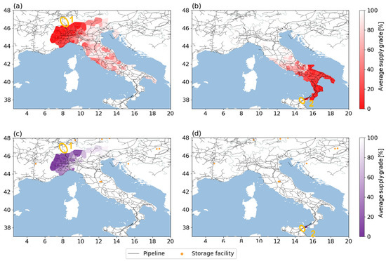 A very important aspect is the information and accuracy of the location of the natural gas sources and natural gas storage facilities. The offshore sources and the sources resulting from LNG terminals, and import pipelines are given by the ENTSOG transparency map and trade statistics [51], respectively. The storage facility information is collected from the ENTSOG transparency platform. The storage facilities have a dual role in the natural gas system as they can consume natural gas (storage filling) or supply natural gas (storage withdrawal). Depending on the location in the network, a storage facility can support up to the total natural gas flow loss in case of a pipeline failure [41]. For this reason, the effects of the storage facilities are in particular examined.