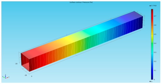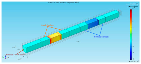 The finite-element multiphysics software Comsol was employed for the numerical simulations to solve a series of physical magnitudes with the input excitation of acceleration in a time-dependent mode (Figure 3). The electrolyte in EAM was an iodine–potassium-iodide solution in which the reaction was essentially the mutual conversion of iodide and iodine ions, i.e., . Potassium ions do not participate in the reaction; thus, the zero-flow boundary conditions should be used for the potassium ions on the electrodes. To simplify the convergence of the simulation results, no slip boundary conditions were applied to the solid surfaces. Electrical insulation conditions were applied to the electric field on the surface of the insulating layer and zero-ion flow boundary conditions were applied to the ion transport. The influence of the electric field was ignored on the left and right exits, after taking into account the distance from the electrode. With the change of external acceleration excitation, an inconsistent pressure distribution is generated due to the microfluidic motion inside the channel, which will change the rate of the electrochemical reaction on the surface of the cathode and anode (Figure 4). By differentially outputting the currents of the two pairs of cathodes, an output current signal generated by the electrochemical vibration sensor at this moment can be obtained.