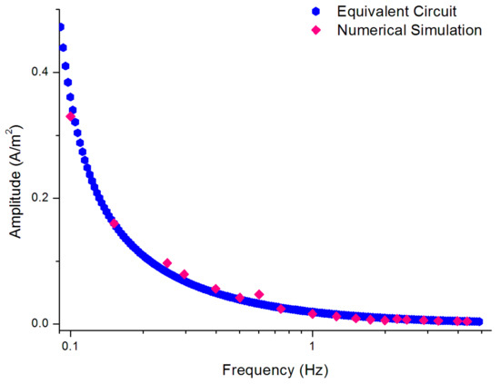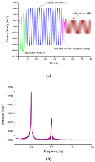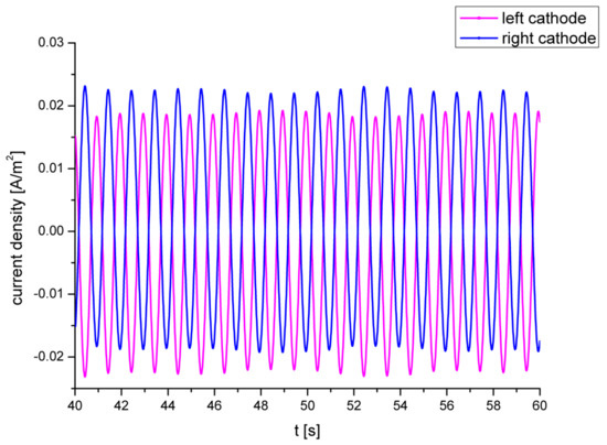The current densities on the anode and cathode were acquired by probes and solved under a sinusoidal encouragement of 1 Hz (Figure 5). The graph contains a small linear component, although it has no effect on subsequent analysis. Compared with the situation in [2], the results of the numerical simulation in this paper were validated, and the feasibility of the concept of proposed simulation was demonstrated.