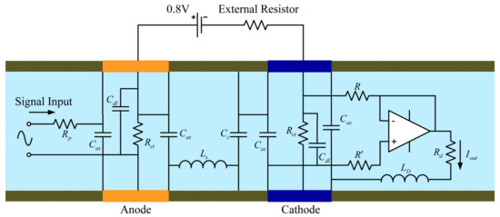The model designed to simulate the sensitive chips allows different variables in the model to be adjusted (such as the widths of the cathode and anode, aperture of the single channel of the sensitive chip, and width of the insulating layer between the cathode and the anode). For the single-channel simulation model of sensitive chip, certain variables in the model such as the single-channel aperture are insensitive to frequency variation of the external vibration excitation signal. When these variables change in the model, the output signal of the model does not change significantly for external vibration excitation signals at different frequencies. For the single-channel simulation model of the sensitive chip, the frequency variation of the external vibration excitation signal depends on certain variables of the model (such as the length of the channel, density of the electrolyte, and effective cross-sectional area of the electrode between the channels). A change in these variables in the model causes a significant change in the impedance of the external vibration excitation signal. As the frequency of the external vibration excitation signal increases gradually, the impedance value of the model to the output signal will decrease accordingly, thereby causing the output signal to change in amplitude and phase. The effect of this change is similar to the effect of a capacitor on an output signal in a circuit. Compared to the aforementioned capacitive effect, for the single-channel simulation model of the sensitive chip, there are certain variables of the model (distance between the cathode and anode, diffusion coefficient, etc.) for which the frequency variations of the external vibration excitation signals are similar. However, contrary to the capacitive effect, as the frequency of the external vibration excitation signal is gradually increased, the impedance of the output signal of the system is increased, resulting in an output similar to the circuit in amplitude and phase. The microfluid in the through-hole of the entire channel will have an impedance effect on the external excitation signal, and the impedance generated is mainly from the hindrance of the inertia of the fluid in the single channel to the external excitation signal. Since this parameter is not sensitive to the frequency of the external excitation signal, the impedance is mainly reflected in the equivalent circuit in the form of a resistance. Now, regarding the effect of the medium inductance on the output signal, by continuously changing the experimental conditions corresponding to the influence of variables in the comparison model on the signal input and output, the equivalent model of the single-channel circuit of the electrochemical sensor can be constructed, as shown in Figure 6.