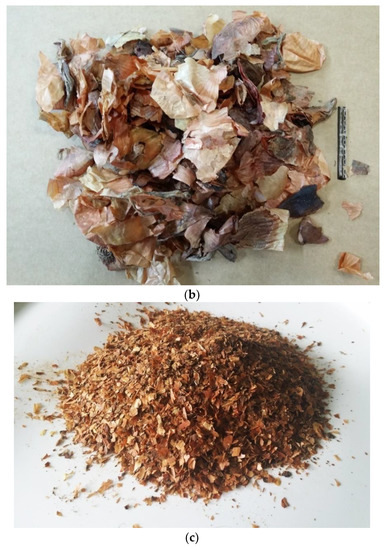 One of the raw waste materials generated in vegetable processing plants is post-production onion waste. According to the Polish Act on waste of 27 April 2001 [9], onion husk was in group 02 (waste from agriculture, horticulture, hydroponics, fishing, forestry, hunting, and food processing), with code 02 03 80 (pomace, sediments, and other wastes from the processing of plant products).