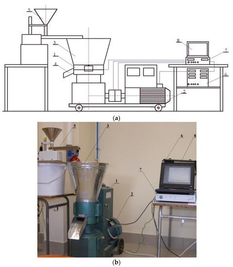 Tests of the pressure agglomeration process (granulation) were carried out at the SS-4 laboratory stand (Figure 2), in which the main element is a P-300 granulator with a flat matrix, as described in previous works [16,27].